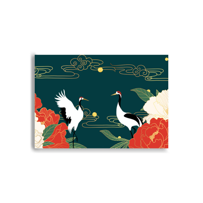 Ce tableau représentant deux cigognes entourées de fleurs rouges et blanches sur fond vert et doré et le tableau qui ornementera votre mur avec subtilité grâce à ses couleurs luxueuses et ses détails.