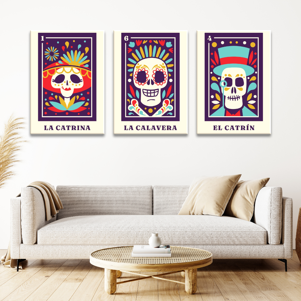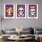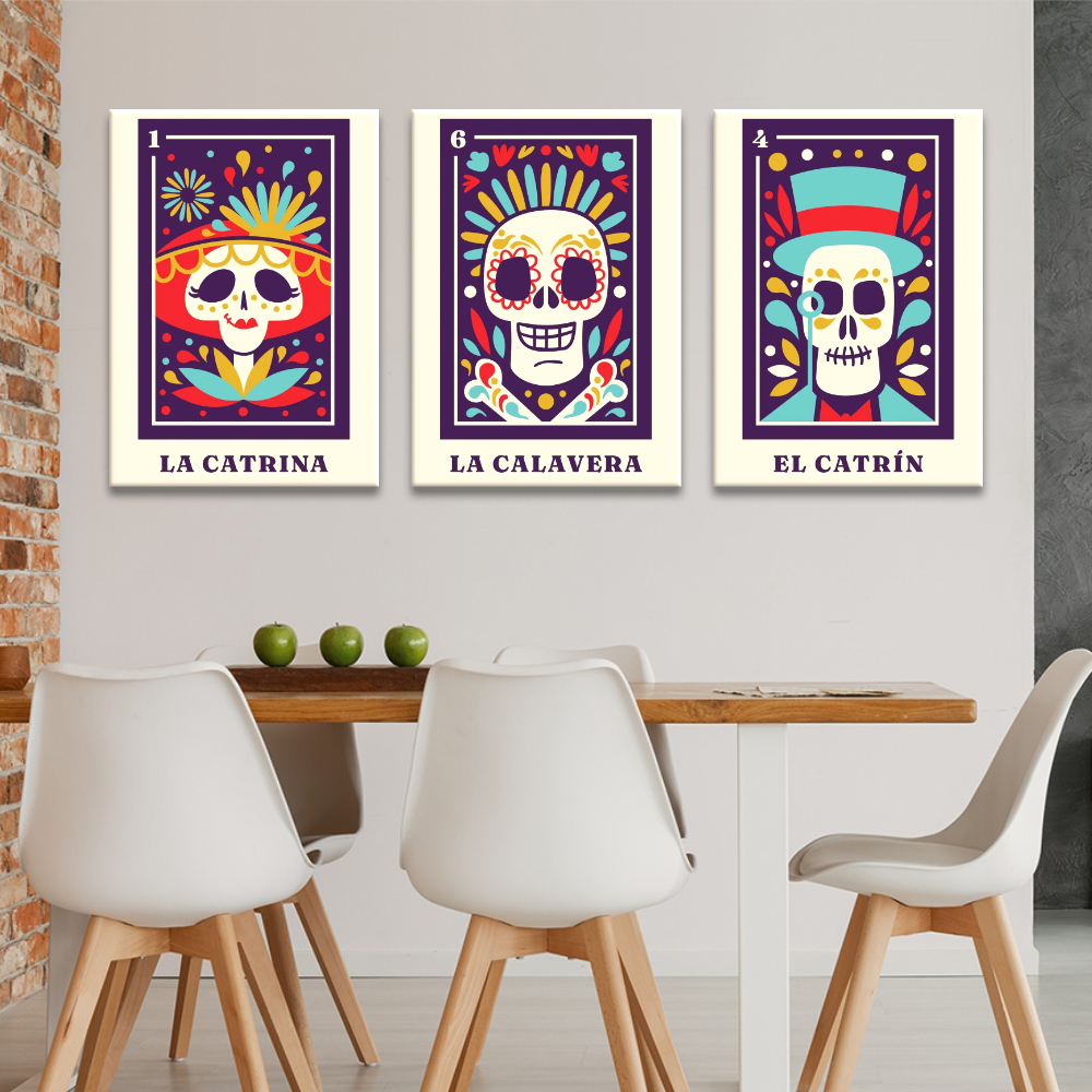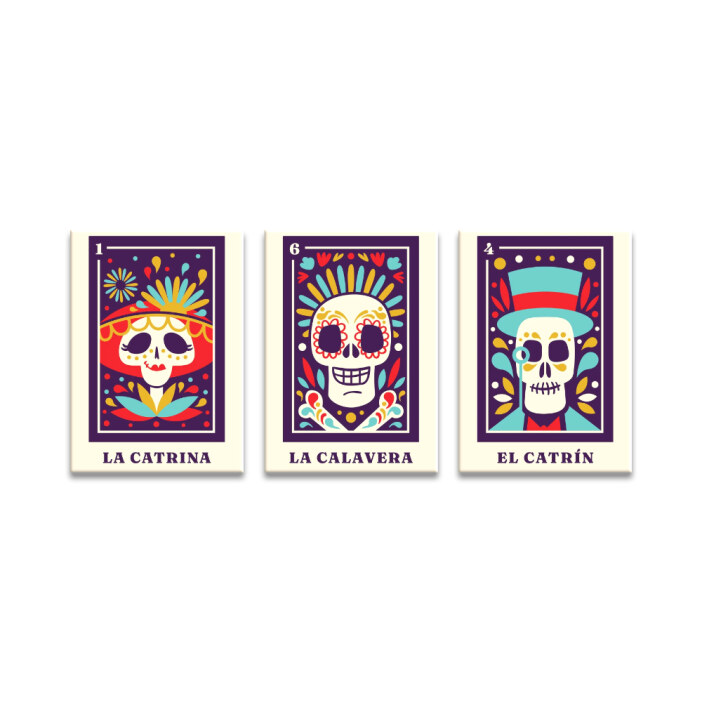 Ce tableau Mexique dessins design jour des morts vous transportera sans tarder au cœur des célébrations traditionnelles du Mexique. À travers ces illustrations colorées de trois symboles, la catrina, la calavera, et el catrin, imprégnez votre décoration d’originalité décalée et festive. Célébré chaque année, le Jour des Morts rend hommage dans la joie aux défunts présents autour de nous.