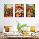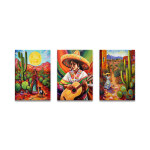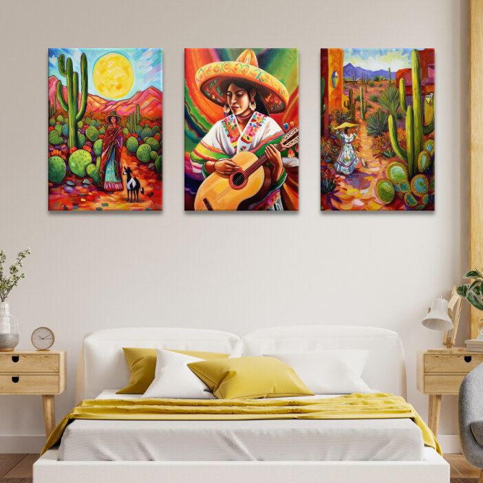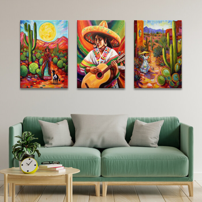 Ce tableau Mexique peintures colorées de femmes mexicaines vous transportera instantanément au cœur des splendides décors désertiques du Mexique. À travers ces sublimes paysages ensoleillés et leurs cactus, vous accompagnerez ces femmes à l’allure authentique. Vêtues de leurs tenues traditionnelles et coiffées de leur sombrero, elles prennent la pose naturellement dans ces décors grandioses peints.